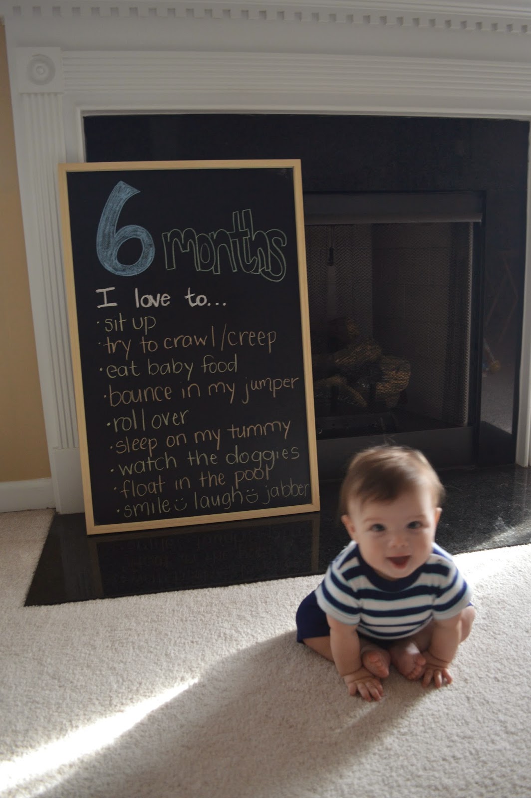 As far as being a 7 month old, he is really good at sitting up. He's eating and enjoying baby food. He's working on crawling. He hasn't mastered it yet, but he's definitely on his way. He's still not usually sleeping all night without waking up, but he's able to just put himself back to sleep, which means more sleep for mommy! Still 2 teeth on the bottom with one trying to make it's way in on the top! He loves to play and roll and creep on the floor. He really loves the dogs, and lucky for us, the feeling is mutual. They're in for a whole new world when he starts crawling, though.